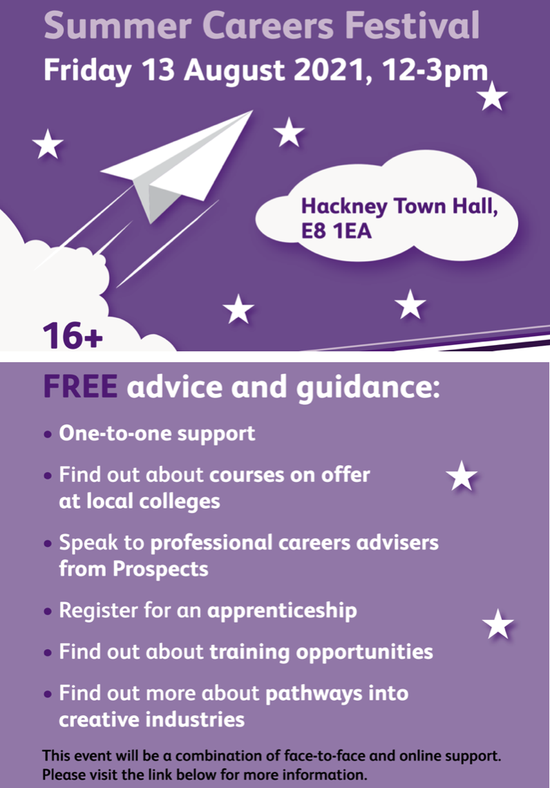 « Back to Campaigns Latest LatestCampaignsIssuesMedia Summer Careers Festival 2021 Monday 9 August 2021 Just received your exam results and unsure about your next move? Then get some FREE expert advice and guidance at the Summer Careers Festival Friday 13 August 2021 12-3pm at Hackney Town For more information email kane.sewell@hackney.gov.uk or call 020 8356 5720 http://younghackney.org/summer-careers-festival @younghackney